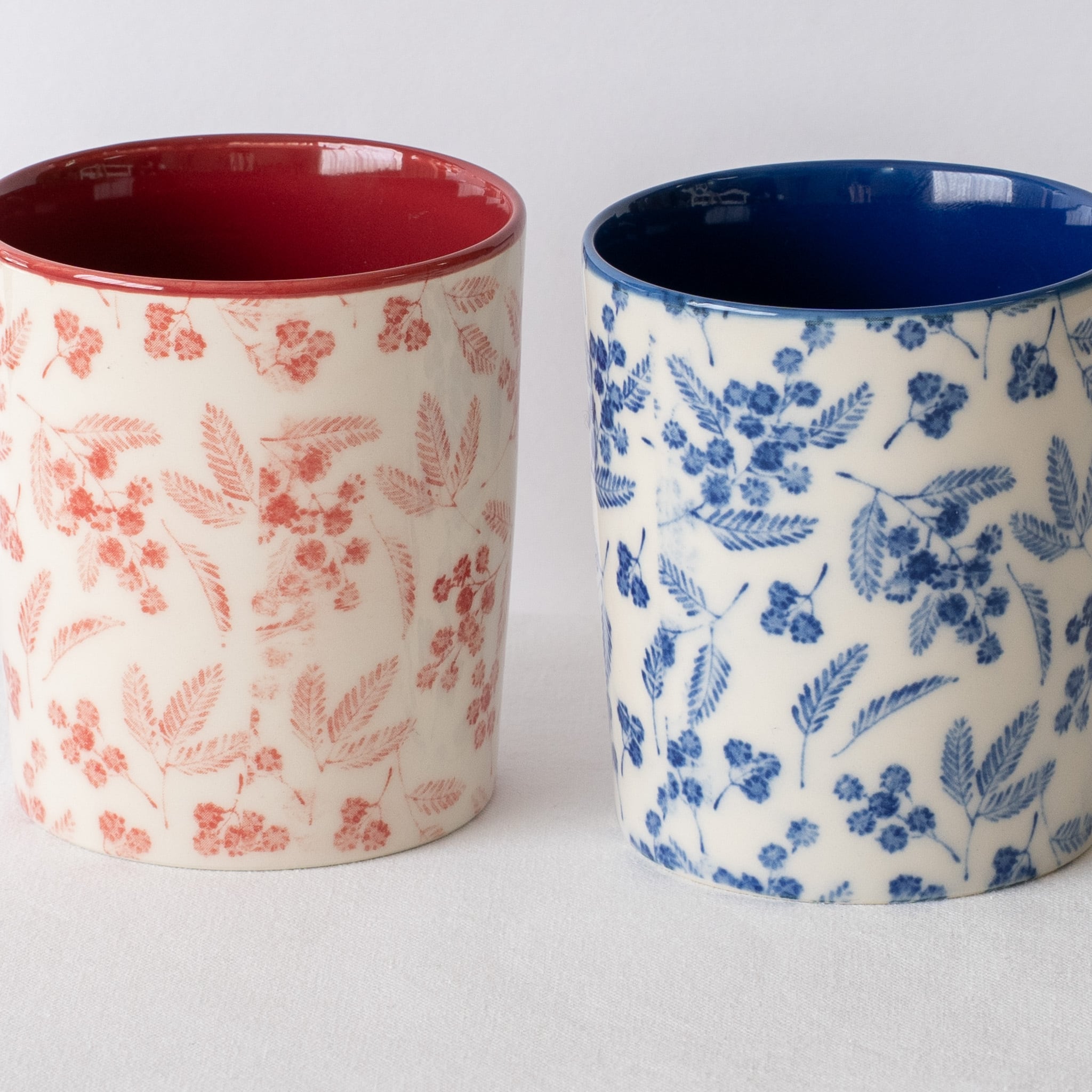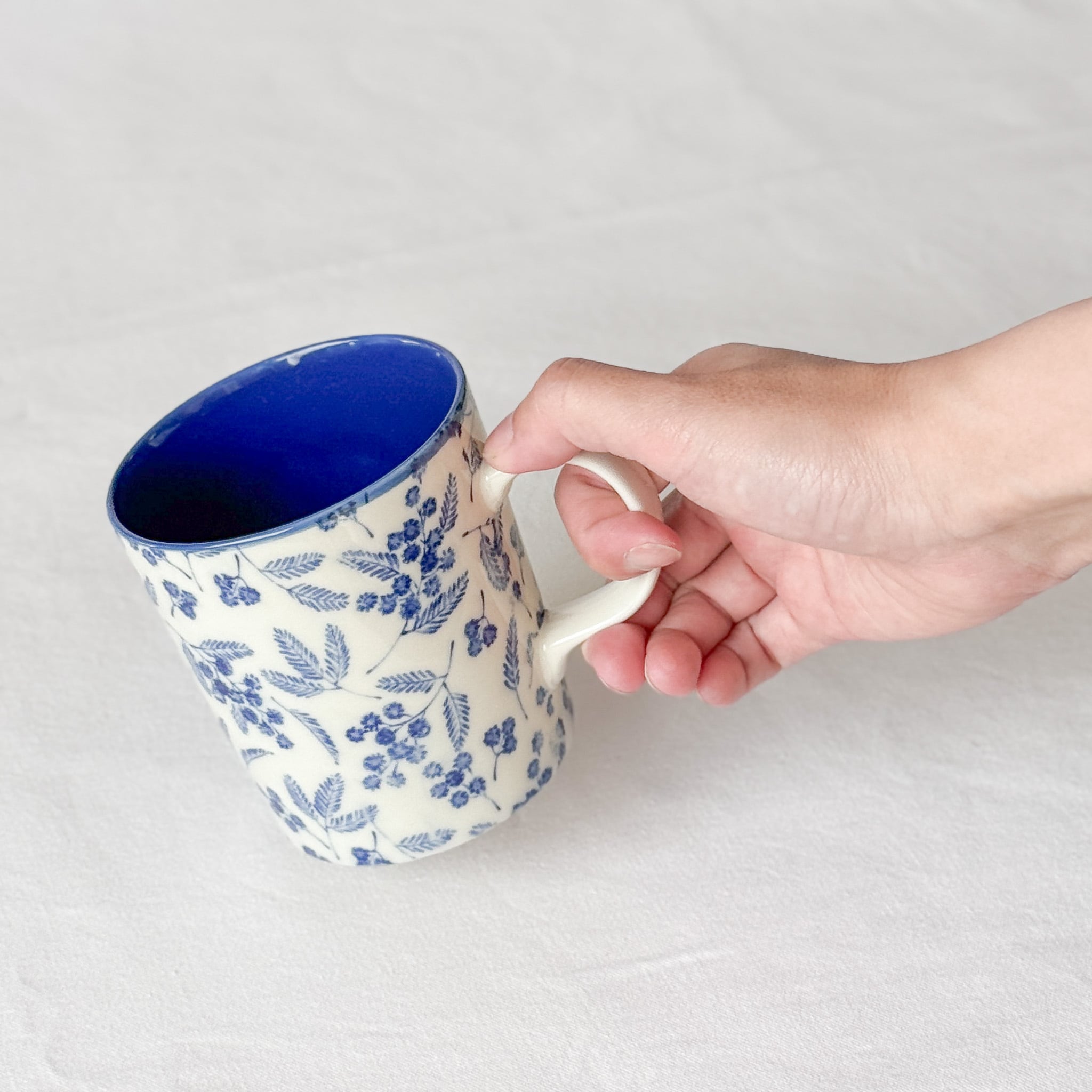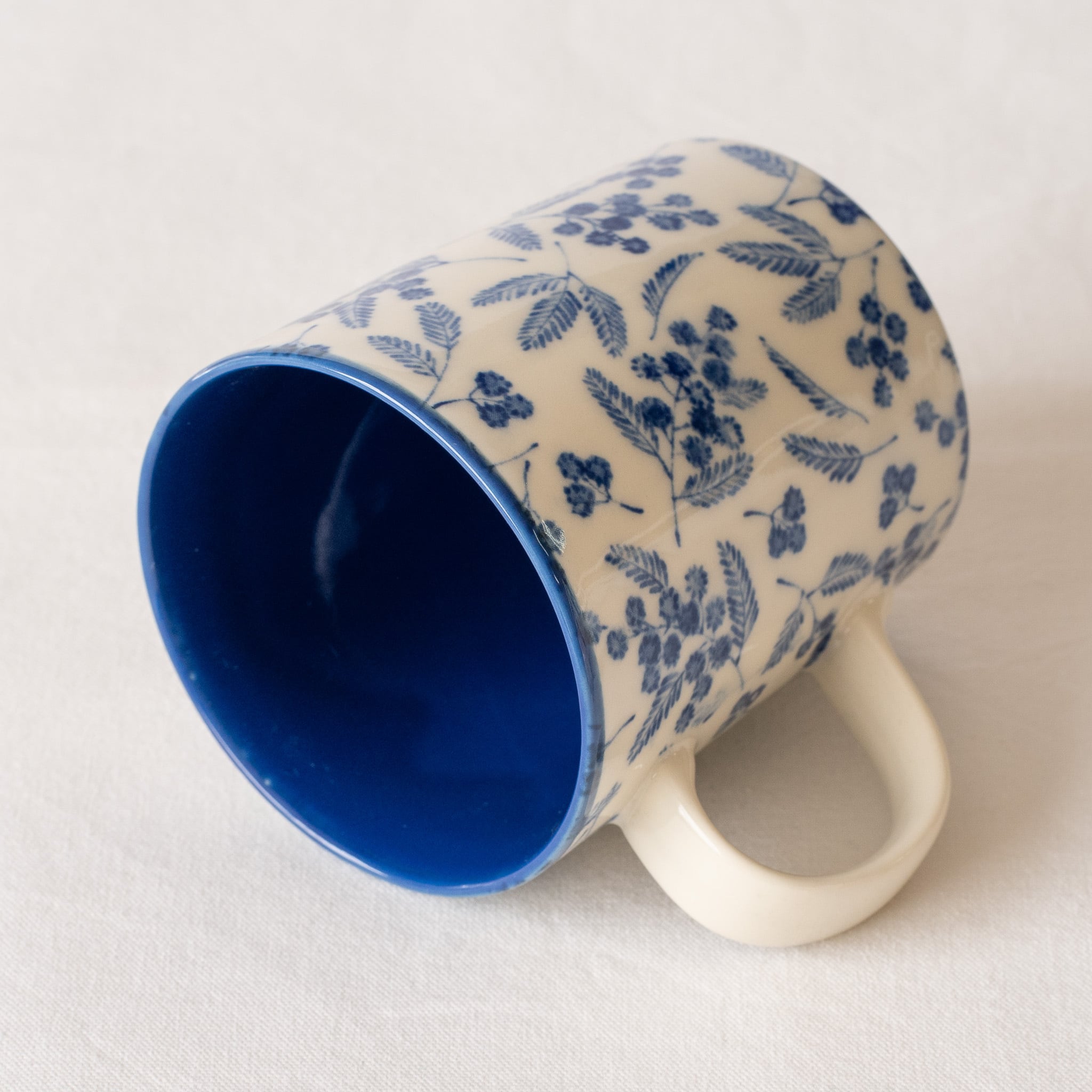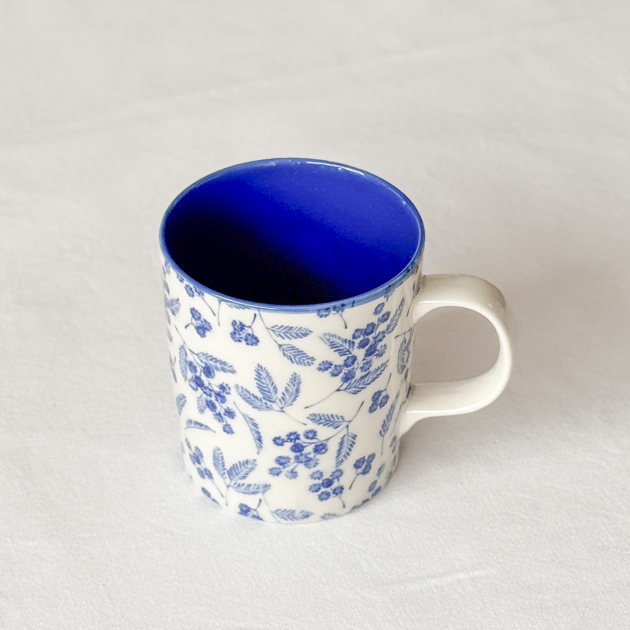 鮮やかな色のミモザ柄に心躍る、春らしいマグカップができました。マグの内部にも釉薬で色をつけた、Kamaniオリジナルのアイテムです。