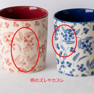 職人さんが「銅版」と呼ばれる柄のついたシートを一つひとつ手作業で貼りつけて焼き上げています。そのため、柄のズレやカスレ等が見られますことをご了承ください。