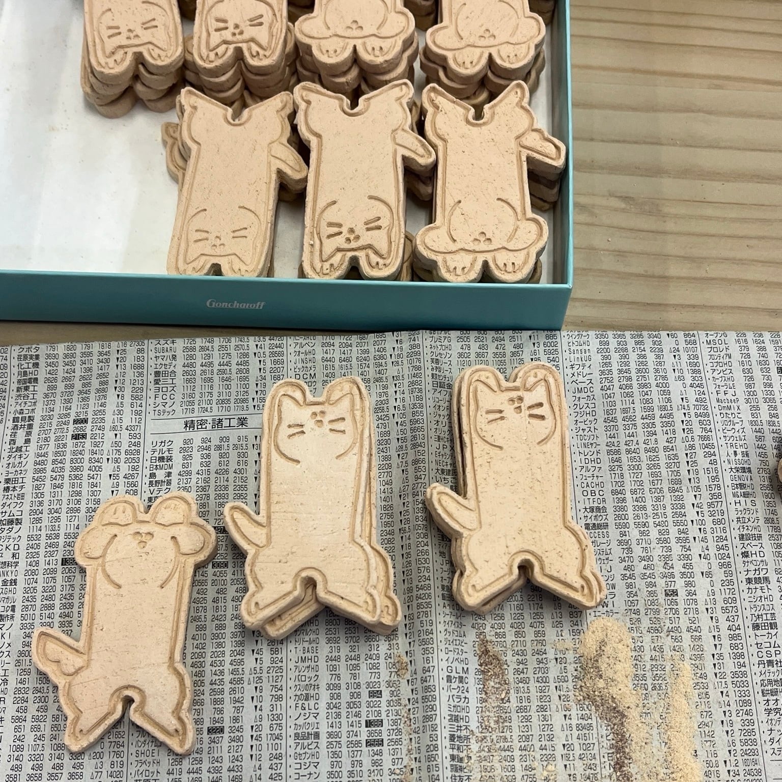 店主が陶芸教室で作っている犬と猫の箸置きです。3Dプリンターで制作した、オリジナルのクッキー型で粘土を型抜きし、形を整えて施釉、焼成しています。